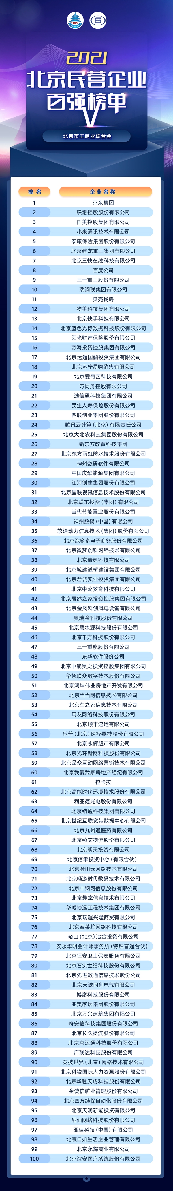 9月16日,北京市工商聯發布2021北京民營企業百強"1+4"榜單,即"北京民營企業百強"+"北京民營企業科技創新百強""北京民營企業文化產業百強""北京民營企業中小百強"和"北京民營企業社會責任百強"。